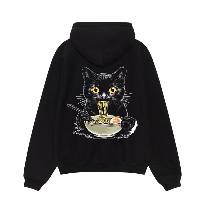 Unisex Pullover Hoodie MOLECULE® 332 RAMEN CAT DTF Print Cotton Blend 300 Gsm Regular Fit Black