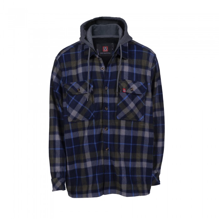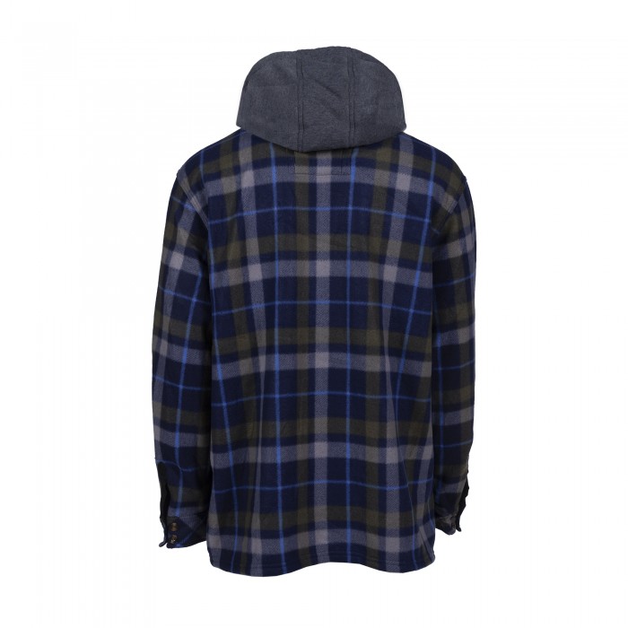 The Hooded Sherpa Overshirt blends jacket-level warmth with the relaxed feel of a plaid overshirt. It includes a fleece lining, hood, front pockets, and button-down closure, making it ideal for layering in cold weather.
